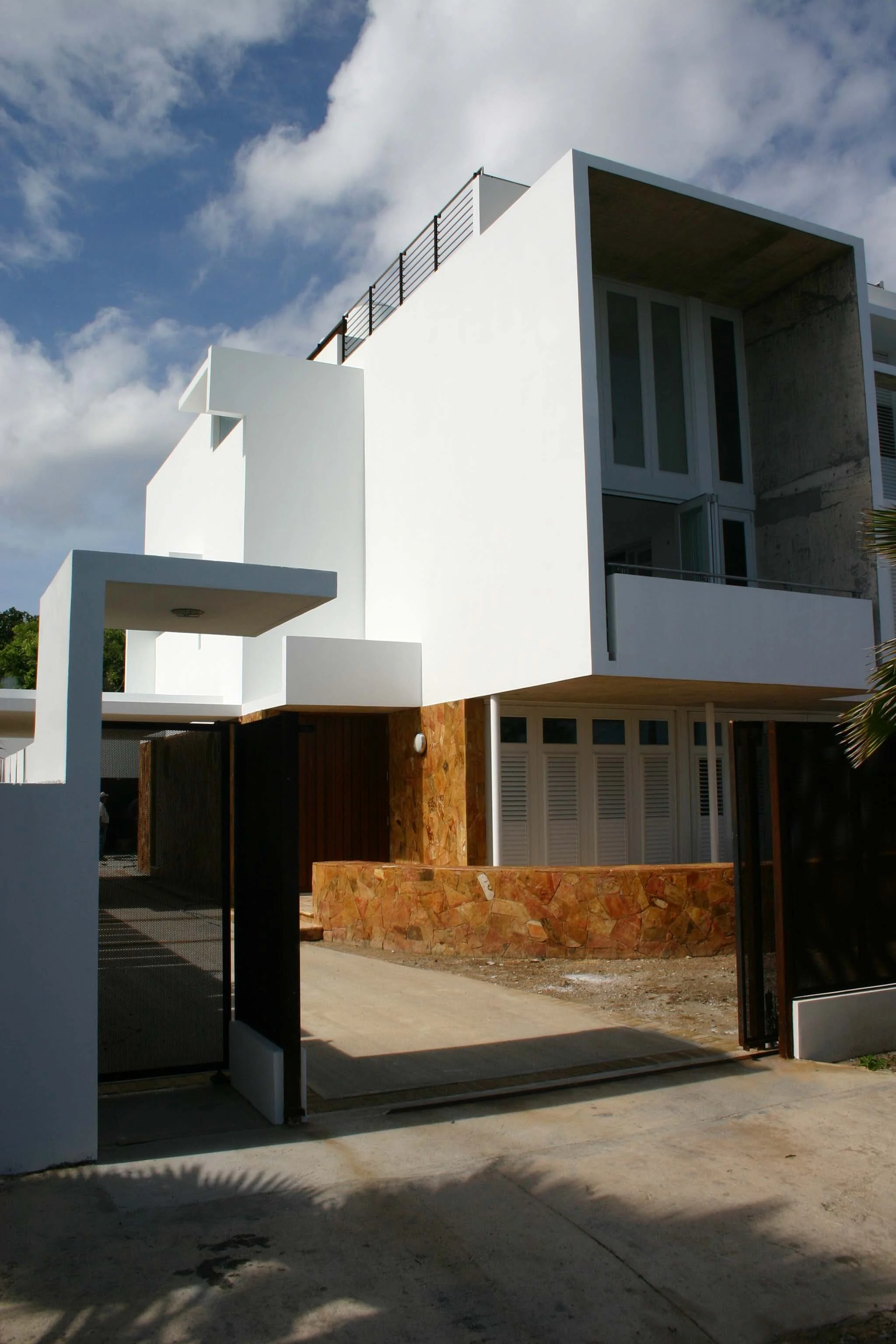 This 3,900 sq. ft. three level structure opens entirely to the sea which lies in front of it. In this way the house bridges between the ocean and the land. The domestic areas are organized around a triple-height space that alludes to the function and scale of the interior patios of the colonial houses. The patio is visually and functionally an extension of the hall and the dinning room. It brings natural lighting and ventilation to the residence. The patio space culminates on the ground floor with a circular pool that is treated as a pond flanking the existing garage annex. The triple height space will be lighted by means of several cylindrical shaped skylights. The skylights in this house are employed as a way to celebrate the intense light of the Caribbean by re-articulating the traditional use of colored glass and surfaces around light openings. The façade is treated as a pervious surface that contains a giant window that frames the view of the sea from the second and third level. All the rooms in this house will be naturally illuminated and ventilated. Additionally, the back of the house is dominated by a ‘brise-soleil’ that neutralizes the impact of the sun in the south façade.The diaphanous and transparent qualities of the north and south facades contrast with the opacity and impermeability of the sides. Due to the inadequacy of lateral views, this elevation was designed with minimal apertures; the few windows are framed by ‘L’ shaped eaves that offer protection from sun and rain.