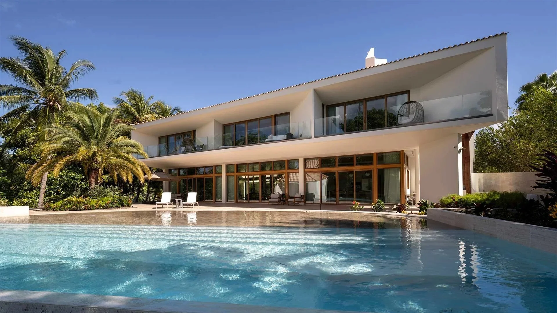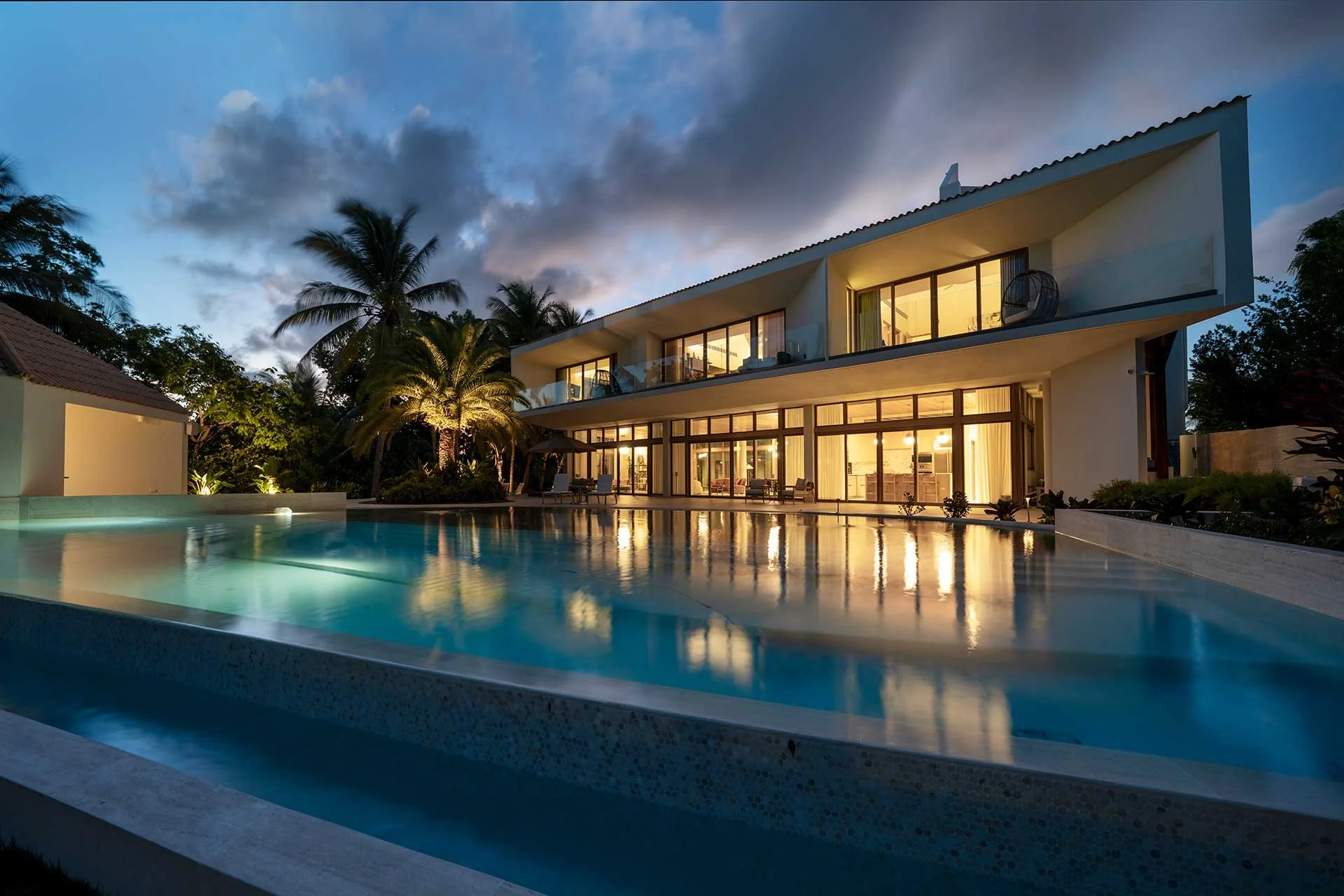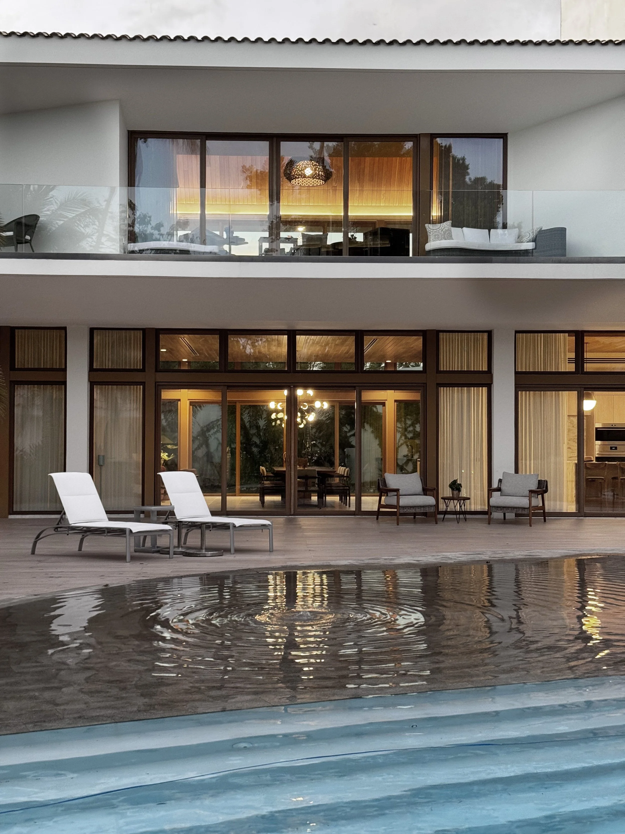 On the second level, expansive balconies overlook the interior courtyard to the north and the estuary and Sierra de Luquillo to the south. These balconies enhance privacy and provide solar protection for the interior spaces. The site is intentionally landscaped with a variety of tropical flora, creating a lush and integrated environment.